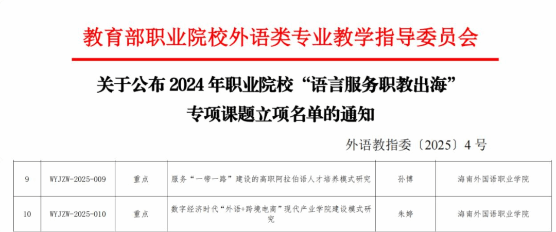 近日,教育部职业院校外语类专业教学指导委员会公布了2024年度“语言服务职教出海”专项课题立项名单,beat365英语学院孙博老师为负责人的课题“服务‘一带一路’建设的高职阿拉伯语人才培养模式研究”和国际商务学院朱婷老师为负责人的课题“数字经济时代‘外语+跨境电商’现代产业学院建设模式研究”等2个课题获批重点课题立项。