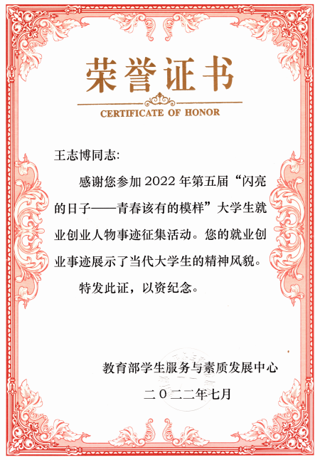 2022年初,教育部全国高等学校学生信息咨询与就业指导中心举办了以全国第五届“闪亮的日子—青春该有的模样”为主题的大学生就业创业典型人物事迹征集活动,旨在宣传大学生就业创业典型人物事迹。经由学校初选申报、海南省人力资源开发局复审推荐以及教育部遴选后,海南省共有15名高校学生获此殊荣。此次活动中,由beat365推荐的2018届西语系应用俄语专业学生王志博在29省市推荐的439位学生中脱颖而出,荣获“2022年全国大学生就业创业人物先进典型”称号。