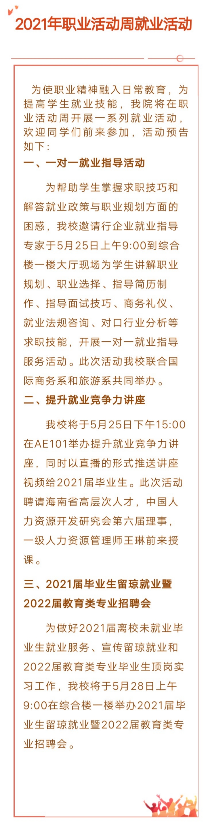 就业动态 当前位置: 首页 >> 就业动态 >> 正文 2021年职业活动周就业活动 发布日期:2021-05-14 点击: 上一篇:我院组织参加2021届高校毕业生就业工作第二次调度视频会议 下一篇:beat365官方网站 2021届毕业生留琼就业暨2022届教育类专业招聘会