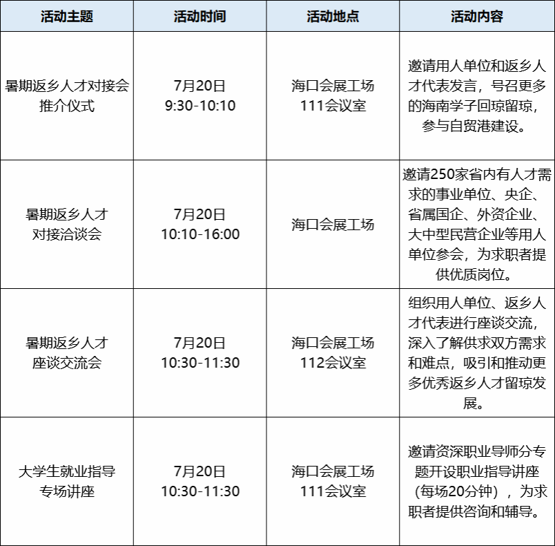 活动内容:邀请金融、能源、生物医药、新材料等领域的返乡人才代表30-40名,参观走访海南生态软件园、海口国家高新技术产业开发区,实地感受海南自贸港发展现状,了解海南发展前景和人才需求。