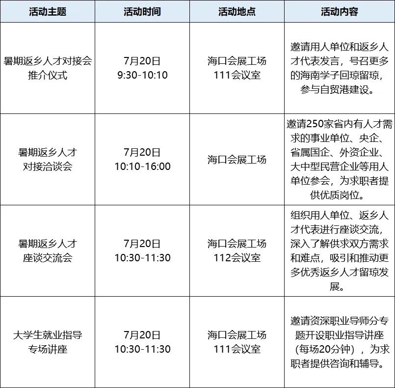 ●线下参会方式:按要求填写海南省2024年暑期返乡人才对接会岗位征集表(点击蓝字下载),发送至邮箱:wangqiang1@hnhold.cn