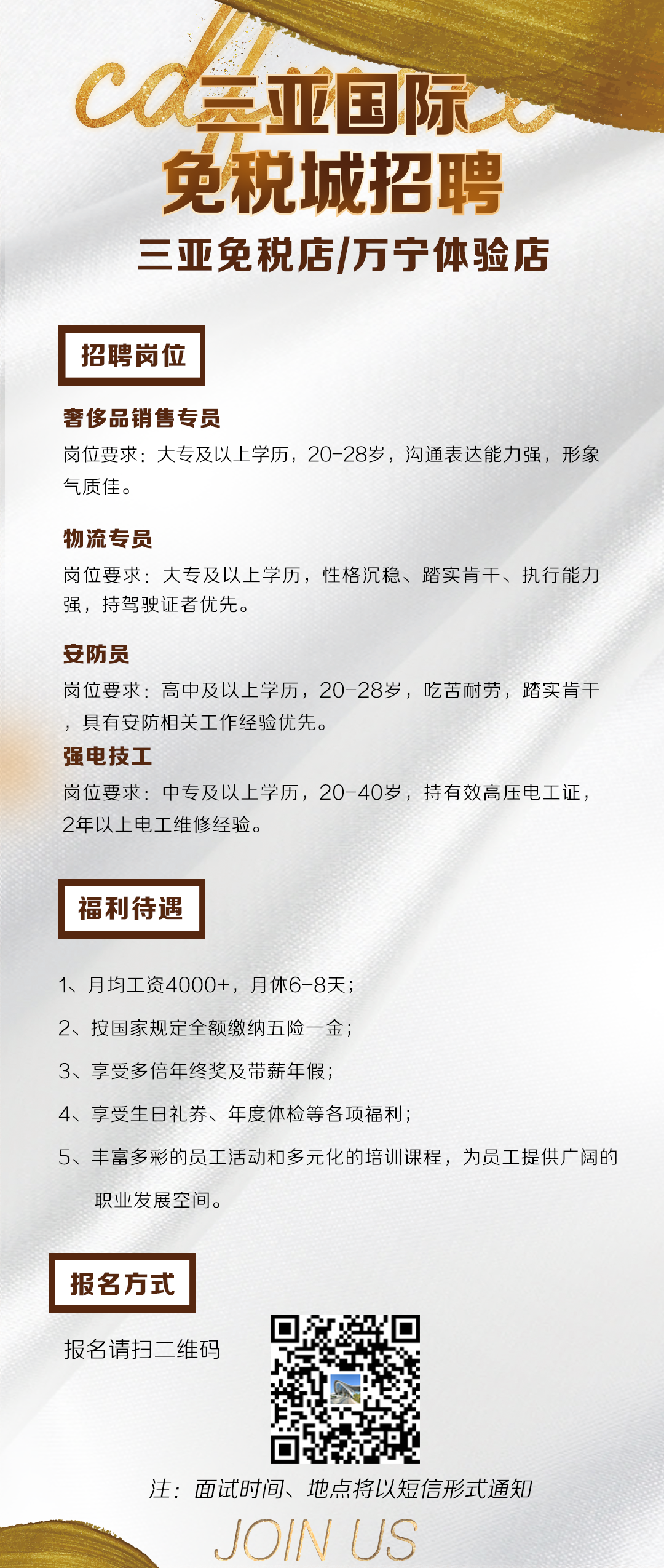 招聘信息 当前位置: 首页 >> 招聘宣讲 >> 招聘信息 >> 正文 三亚国际免税城招聘 发布日期:2020-06-22 点击: 来源:中免集团三亚国际免税城招聘 (温馨提示:新型冠状病毒肺炎疫情期间,请往邮箱投递简历。在未被进一步通知的情况下不要擅自前往应聘单位。招聘公司地址仅以本网站为准,请同学们面试时注意核对。) 上一篇:招聘信息 | 遇见 你想未来 WESTLINK西遇2020校园招聘 下一篇:深圳市飘美科技有限公司招聘简章