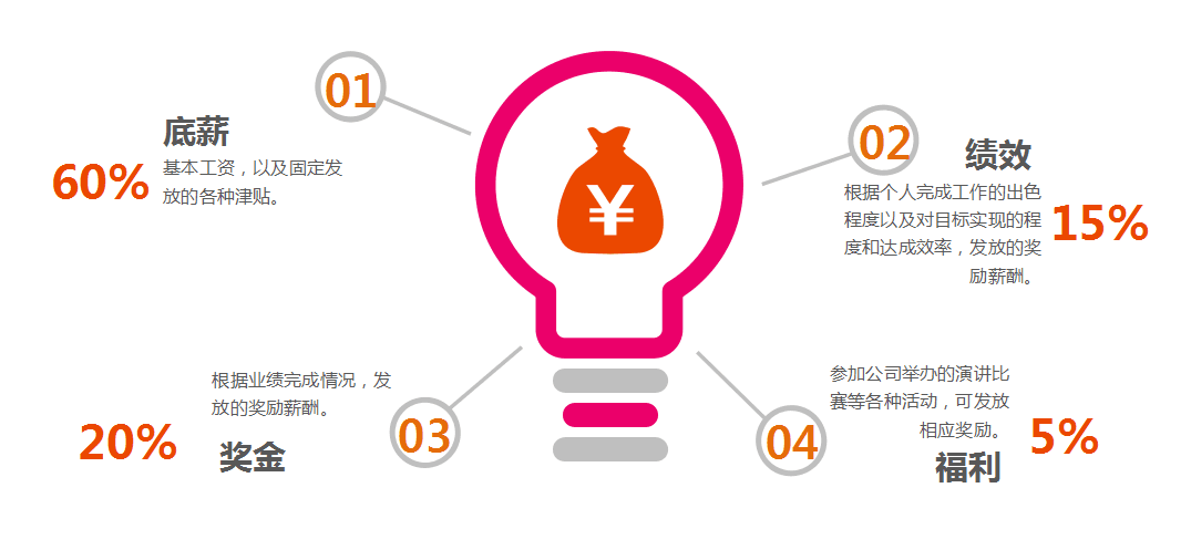 4、有竞争力的薪酬体系,工资多少与个人能力挂钩(底薪+绩效+奖金+其他补贴)