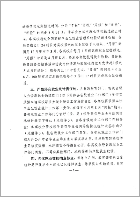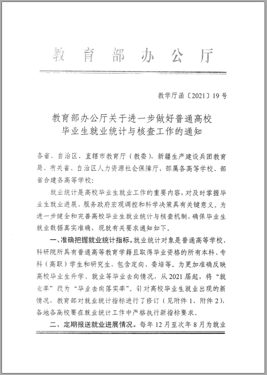 就业创业政策 当前位置: 首页 >> 就业创业指导 >> 就业创业政策 >> 正文 教育部办公厅关于进一步做好普通高校毕业生就业统计与核查工作的通知 发布日期:2021-06-02 点击: 上一篇:2021届毕业生报到、改派、补办报到证注意事项 下一篇:毕业生报到与未就业实名制登记流程图