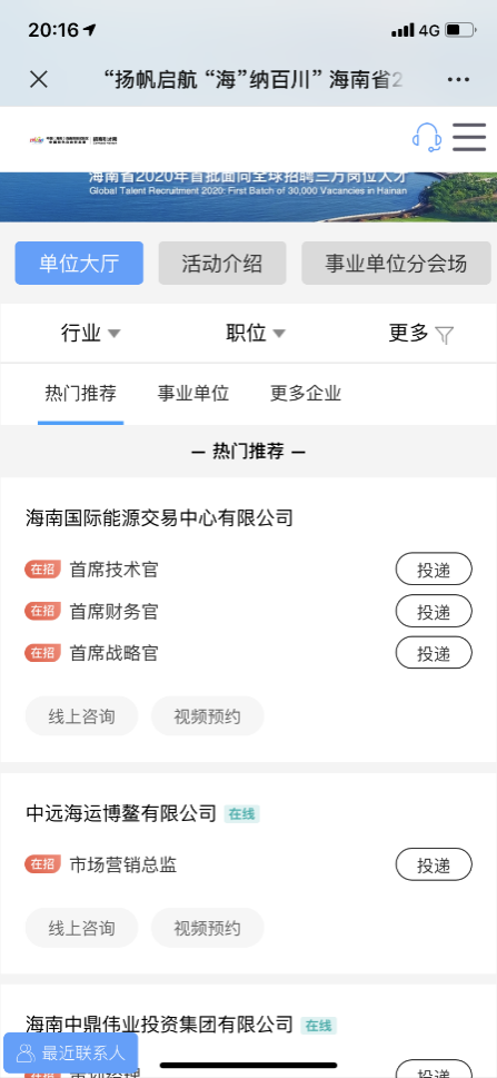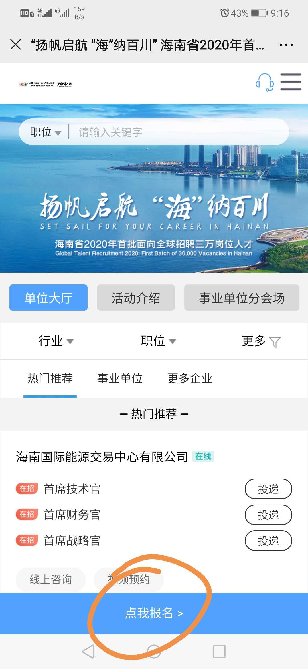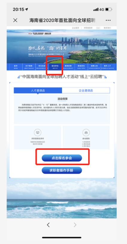 通知公告 当前位置: 首页 >> 通知公告 >> 正文 手机操作手册及常见问题处理指南 发布日期:2020-05-27 点击: 登录操作方式【手机端】 1、微信扫码进入,进入活动页面; 2、点击【报名参会】-【点击报名参会】; 3、进入求职者大厅,点击下方【点我报名】; 4、选择【求职者登录】,使用手机(账号) 注册登录;进入简历投递界面; 5、创建简历 6、填写教育经历(必填非常重要)!!! 7、填写就业意见(必填) 8、简历创建成功 9、投递简历 上一篇:beat365官方网站2020届毕业生第二场网络视频双选会 下一篇:beat365官方网站2020届毕业生网络视频双选会参会指南