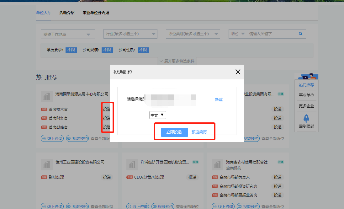 (注意:点击意向职位投递简历时,建议预览简历,确认简历内容、格式)