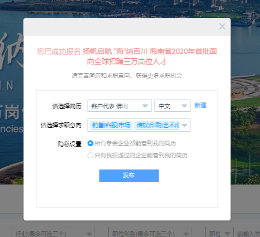 注意:先前已创建好简历的用户会直接提示报名成功(可跳过本步骤)。否则,会跳转至简历创建页面,见步骤(2)。