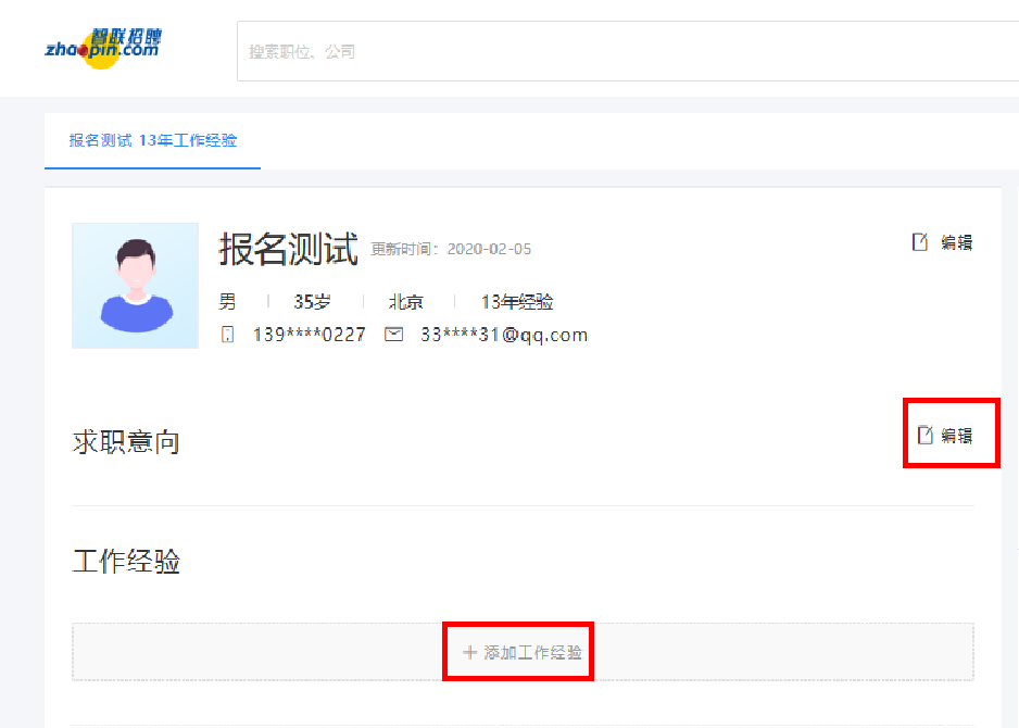 (2)点击“编辑”和“添加工作经验”可新增简历内容以及对当前内容进行修改,需尽可能的完善简历;