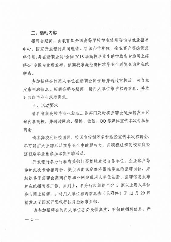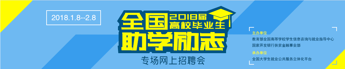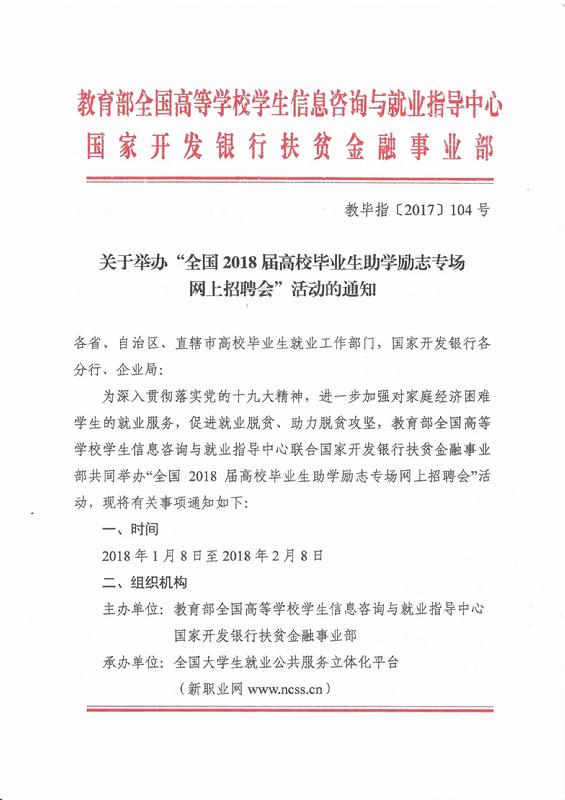 通知公告 当前位置: 首页 >> 通知公告 >> 正文 关于举办“全国2018届高校毕业生助学励志专场网上招聘会”活动的通知 发布日期:2018-01-12 点击: 时间:2018年1月8日——2018年2月8日 网址:http://www.ncss.org.cn/wlzph/zxlzzph/ 上一篇:2018届毕业生求职知识讲座 下一篇:beat365官方网站2017届毕业生就业质量年度报告