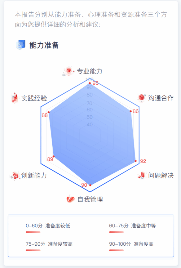 就业准备测评是一项专业的评估工具,旨在帮助你了解自己的职业兴趣、优势和适合的职业方向。通过一系列的评估和测试,你将获得一份详细的职业报告,为你的就业之路指明方向。涵盖了多个方面,包括职业兴趣、个人能力、价值观等。通过专业的评估,你将深入了解自己的职业性格和倾向,为选择适合的职业提供科学依据。并且就业准备测评不仅提供了评估报告,还为你提供了个性化的建议和指导。无论你是正在寻找实习机会还是准备毕业后就业,这份测评都将是你不可或缺的指南。