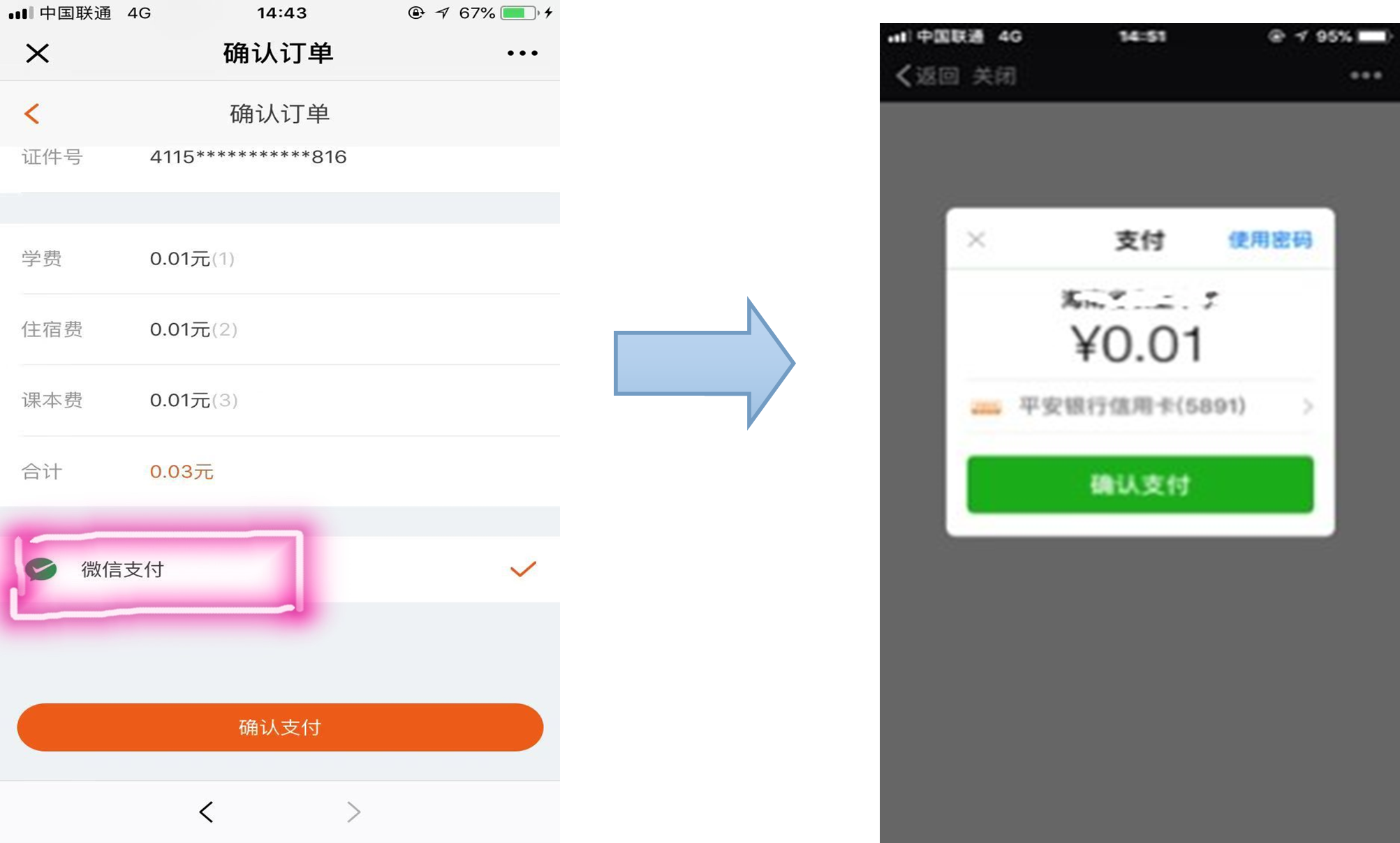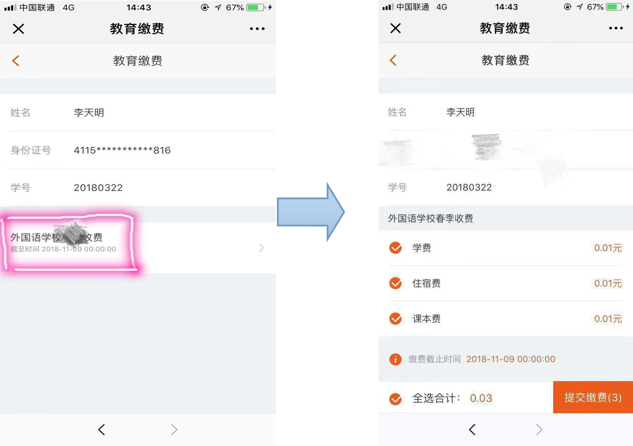 3.输⼊缴费姓名和身份证号:请在学号处输入身份证号(如果身份证号最后一位是X,必须大写)