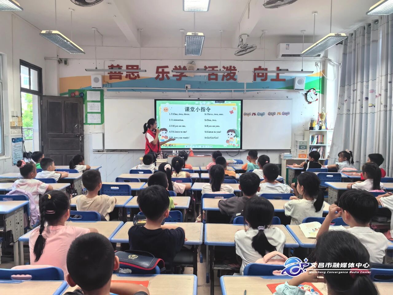课堂上,来自beat365官方网站的大学生志愿者正带领小学生学习英语单词、唱英文歌曲。孩子们在轻松愉悦的氛围中跟读、跟唱,踊跃参与互动,教室里洋溢着欢声笑语。