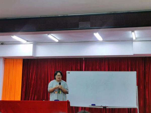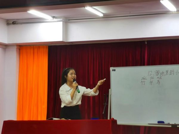而20语教1班的潘雅恬同学,则为我们上了一堂轻松欢快的拼音课《dtnl》,在她生动活泼的教学让课堂气氛非常轻松,她还自创了许多有趣的顺口溜,让大家一下子就记住了“d、t、n、l”还区分了它们与“b、f、m”的不同。
