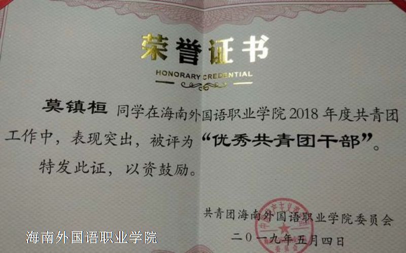 莫镇桓同学在纪念“五四”运动100周年活动获得“优秀共青团干部”称号
