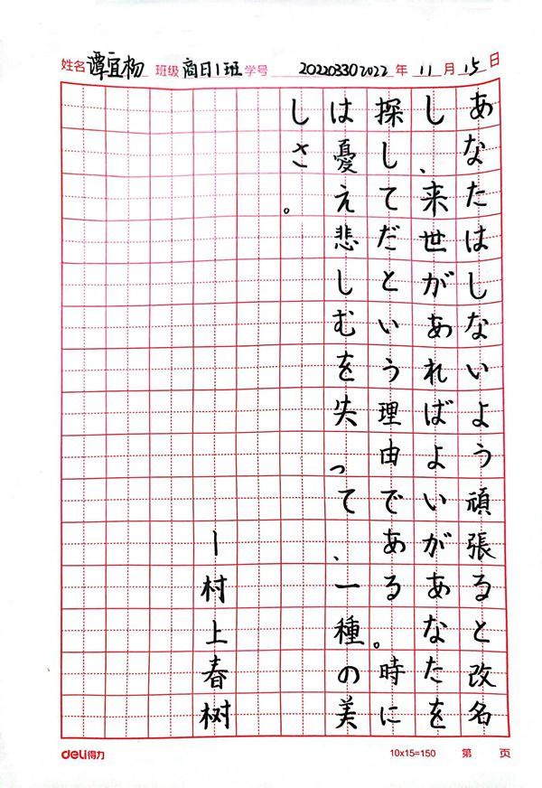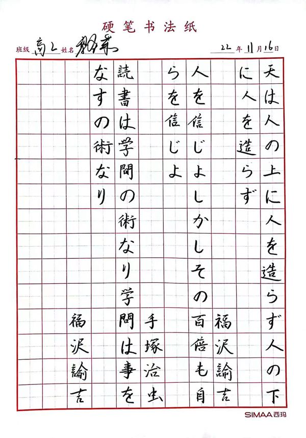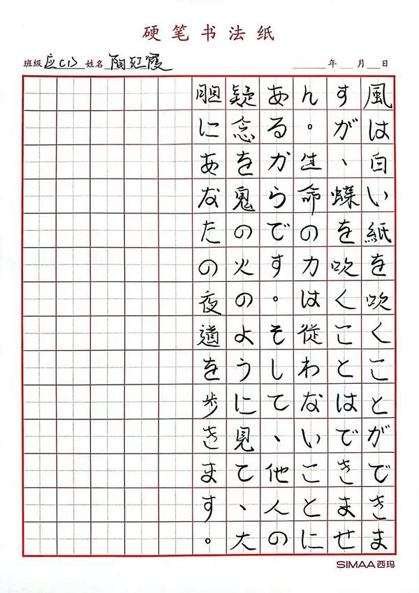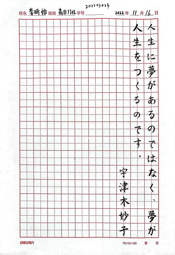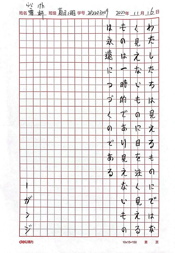 苍颉鸟迹既茫昧,字体变化如浮云。为充实校园文化生活,营造浓厚的校园文化氛围,激发学生的对日语的兴趣与爱好,提高我专业学生的艺术修养和审美情趣,在2022年冬季小学期期间举办了22级书法大赛,给多才多艺的同学们提供一个展示的平台。