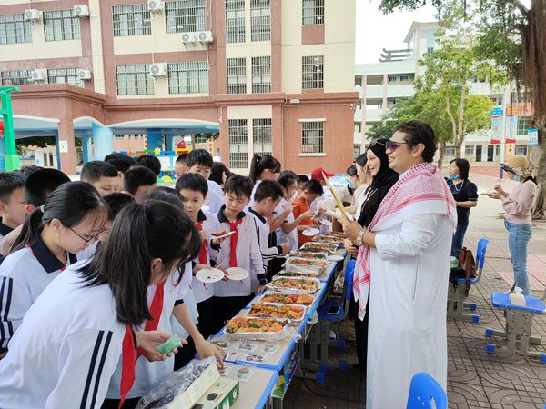 活动过程中,首先由阿语外教以及阿语学生带学简单阿拉伯语问候语,带领三小学生感受阿语语言魅力,并对发音优秀的学生给予埃及名胜古迹冰箱贴奖励;邀请三小师生品尝阿拉伯特色美食椰枣、烤鸡和玛赫什。此外,阿语外教演唱了热情欢快的阿语歌曲,活跃现场氛围,让三小师生感受到了独特的异域风情和阿拉伯人的热情。
