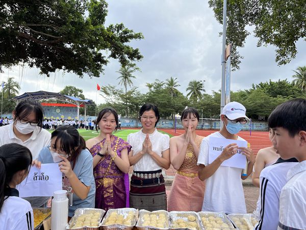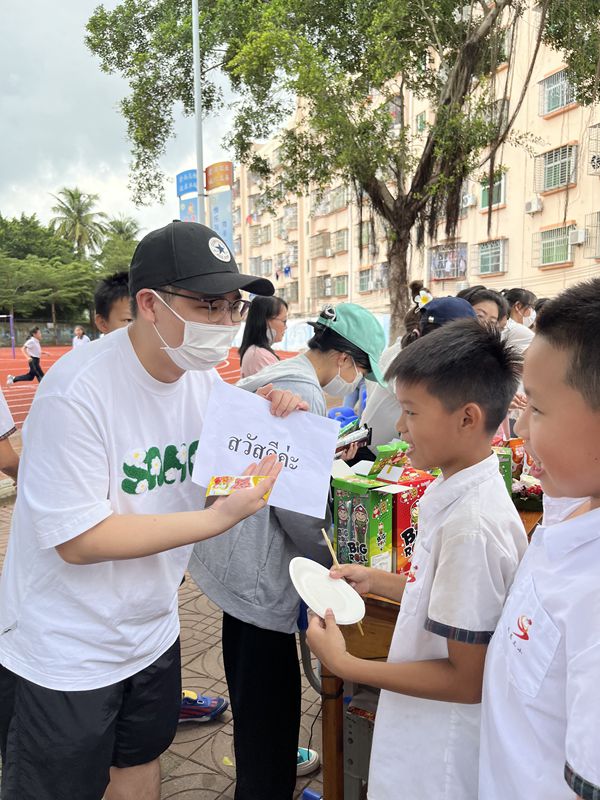 泰语专业的师生则是给小学生进行简单的语言教学,参与互动的学生就可获得品尝泰国美食的机会。泰语专业学生为了吸引小学生的眼球,使出浑身解数,唱泰语歌,跳泰国游戏舞蹈“烤鸡舞”,整个活动进行了一个小时,学生互动积极热情。