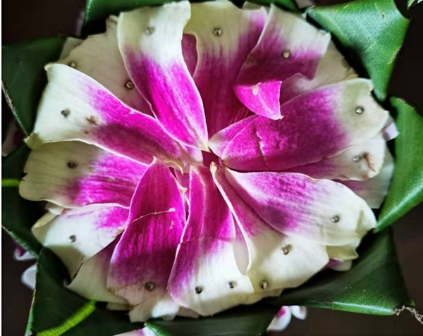 第三步用钉子固定莲花叶片:用钉子将叶片固定在底座上,不过,上方叶片最后的折叠方式与下方相反,再用钉子加固;