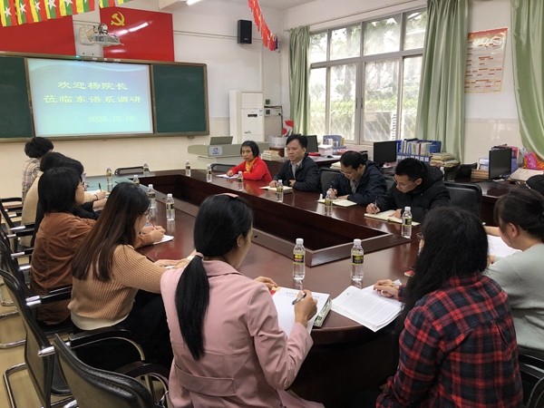 12月18日上午10点30分,杨学前副院长率院办张政主任、教务处赖东明处长、学院督导组长危卫红教授一行5人莅临东语系调研、走访、并召开座谈会。