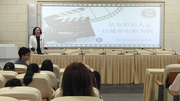 体师生在AE101教室聆听了四川外国语大学东方语学院院长罗文青教授的讲座《从电影到人文--以越南电影为例》。
