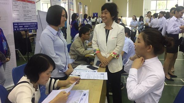 东语系主任郭艳萍教授到招聘会现场与我系合作企业进行交流,了解我系应届毕业生今年的应聘情况。