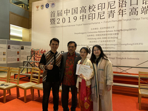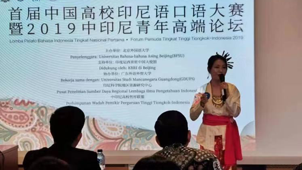 11月16日至17日,首届中国高校印尼语口语大赛暨2019中印尼青年高端论坛在北京外国语大学举办。我院东语系印尼语专业18级学生邓云仙在口语比赛中与来自北京外国语大学、天津外国语大学、西安外国语大学、广东外语外贸大学、广西民族大学、云南民族大学、浙江越秀外国语学院、吉林外国语大学等10所本科院校的学生同台竞技,荣获低年级组二等奖的好成绩。印尼语专业成立于2015年,此次比赛为印尼语专业学生参加的第一个全国性比赛。