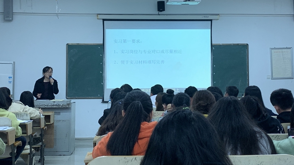 在动员大会上郭艳萍主任对应届毕业生提出两方面的要求:一是认清实习的意义和目的,提高思想政治觉悟、提高业务素质,把书本知识融入到实践中,提高动手能力;二是把握好实习机会,在实习岗位上学会服从、善于观察、主动参与。面对难于寻找到适合个人就业岗位的现实,为自己确定目标,做好人生规划。此外,郭主任还结合多年的工作经验,为同学在实习就业岗位上可能会遇到的困难提出了如何面对和解决的建议。