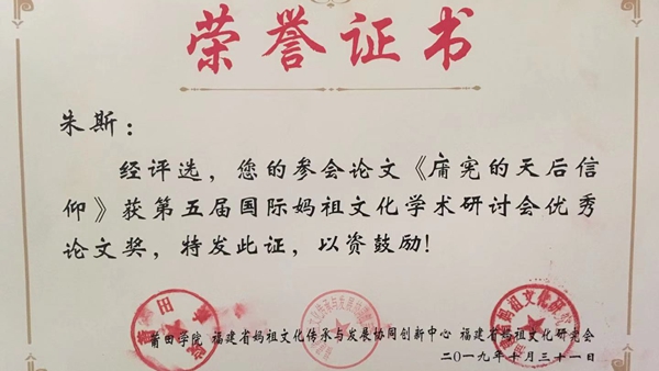 东语系朱斯老师参加第五届国际妈祖文化学术研讨会并获奖