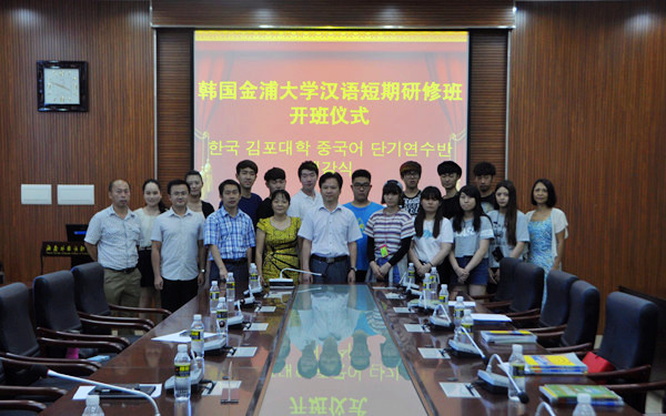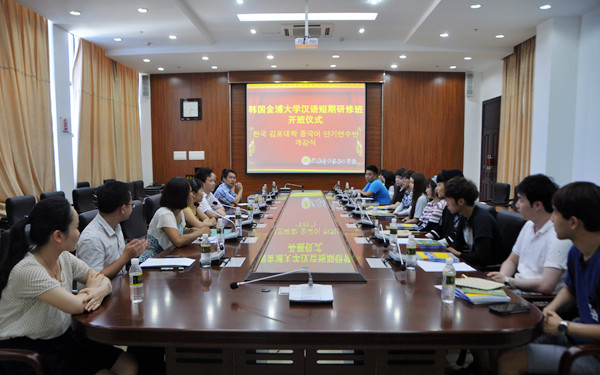 626日下午,我院第四届韩国金浦大学汉语短期研修班在综合楼7楼第一会议室开班,学院杨学前副院长,对外合作交流处、教务处、东语系等部门负责人、研修班授课教师代表以及来自韩国金浦大学的11名学生参加了开班仪式。