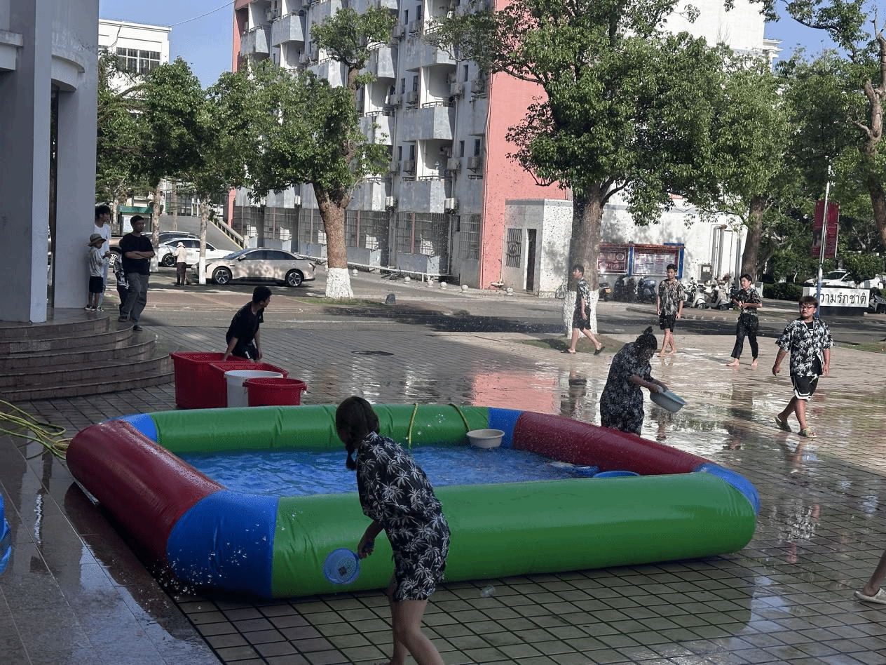 活动当日,泰语系的同学个个身穿泰式服饰,处处彰显着浓郁的泰国风情。生动展现了泰国独特的文化魅力,营造出浓厚的节日氛围。活动现场,师生们身着鲜艳的泰国传统服饰,手持水盆与水枪,伴随着欢快的音乐,相互泼水祝福。水花在空中飞溅,欢声笑语回荡在校园的每一个角落,象征着涤荡旧岁的烦恼,迎接全新的开始与希望。