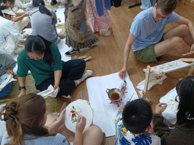 听完后,同学们跃跃欲试,迫不及待想要亲身体验一下。大家围坐在一起,开始动手制作自己的巴迪克蜡染作品。有的同学设计出了精美的花卉图案,有的同学则画出了可爱的动物形象,每一个作品都充满了创意和个性。