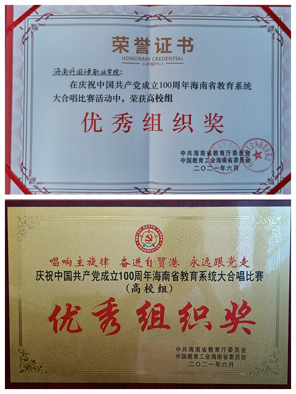 6月18日,“唱响主旋律 奋进自贸港 永远跟党走”庆祝中国共产党成立100周年海南省教育系统大合唱比赛在海南大学思源学堂举行。本次大合唱比赛由中共海南省教育厅党委、中国教育工会海南省委员会主办,共分为市县组、高校组和中职组,共计55支队伍,我院获得高校组优秀组织奖。