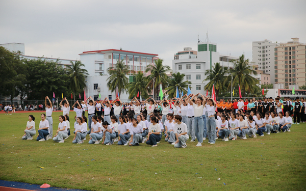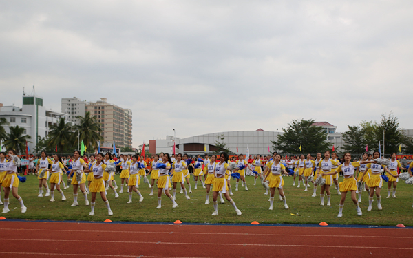 英语系、国商系、旅游系、东语系、西语系和人文艺术系的同学们先后呈现了一场大型团体体操表演,他们舞动着青春与梦想,为即将争锋赛场的运动健儿们鼓舞,他们青春的风采不只在书本上,更在运动与拼搏的热情之中。体育竞技与舞蹈艺术的生动结合表现了我院丰富多彩的校园文化。