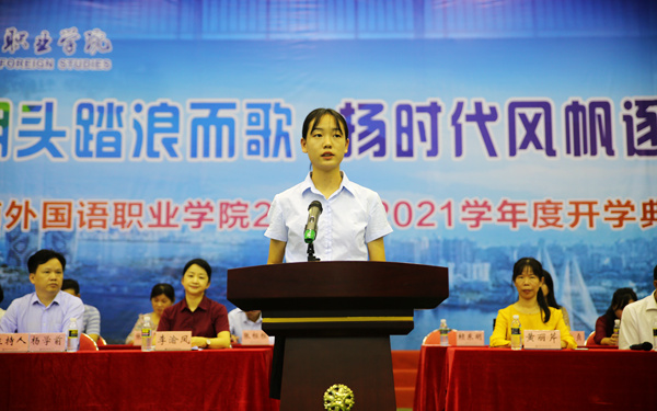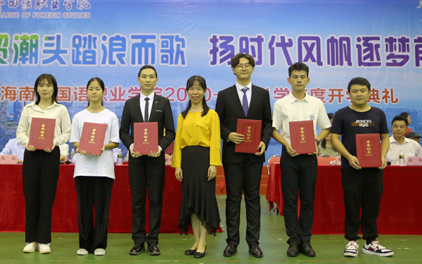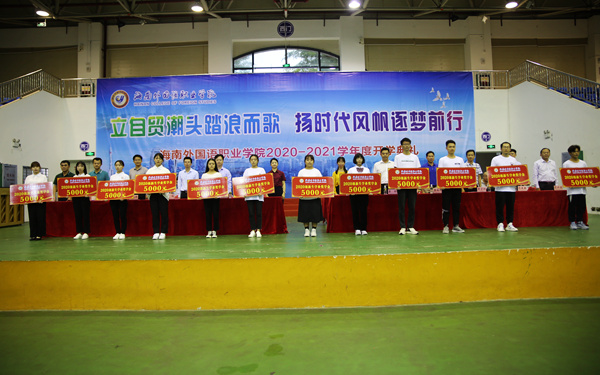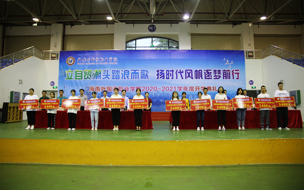 在开学典礼最后,我院对2020级普招新生奖学金、2020级东盟语言专业奖学金、2019-2020学年度国家级和省级技能大赛奖获得者进行表彰。全体学院领导为获奖学生颁奖。