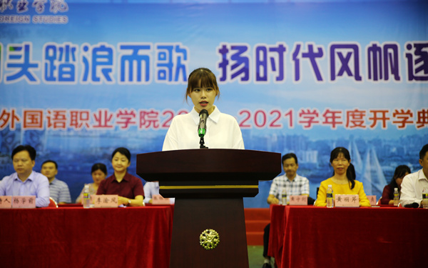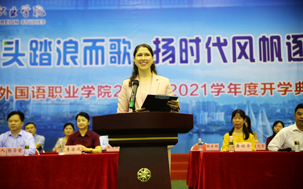 外籍教师代表萨拉表达了自己对新生们未来发展的美好愿景,希望同学们都能掌握好外语,学有所成。