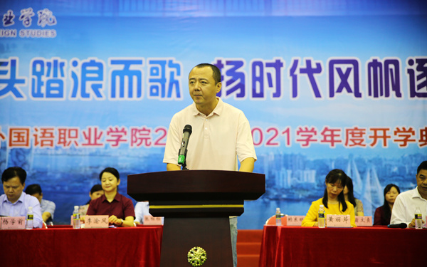 李渝凤院长在致辞中代表学院党政和全体教职工,向来自全国各地的2426名新同学表示衷心的祝贺和热烈的欢迎。她向同学们介绍了学院的历史沿革、办学理念、师资建设、专业建设、师生获奖、对外合作、人才培养特色、多层次联合办学、教科研成果、校园文化建设及服务海南自贸港建设等方面的基本情况,并向同学们提出了三点期望:一是全面发展、以德为先。要把疫情经历的考验转化为学习的动力,树立起正确的世界观、人生观、价值观,坚毅勇敢,感恩奉献,以鸿鹄之志,怀大爱之心,在新时代浪潮中实现全面发展;二是目光远大、格局宽广。要努力掌握好一门乃至多门语言,成长为家国情怀浓厚、具有国际视野和跨文化交际能力、通晓国际规则的“外语+”高素质应用型人才,在海南自贸港浪潮中书写无愧于时代的绚烂青春;三是时代向前、青年向上。要勇于抓住时代契机,和学院共发展,与时代同呼吸,共同为实现中国梦,为海南自贸港建设和我国经济社会发展建功立业。