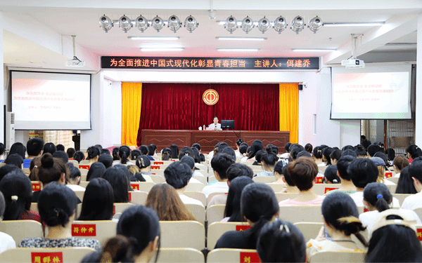6月8日,学校党委副书记、校长杨学前为人文艺术学院200多名学生讲授思政课。他指出,同学们生逢其时,是全面建设社会主义现代化强国的见证者、现代化参与者、奋斗者和创造者,寄语同学们要紧跟伟大的时代、奋斗的时代,争做有理想、敢担当、能吃苦、肯奋斗的新时代好青年,以接力奋斗的历史主动诠释中国式现代化的青春担当,擦亮中国式现代化的青春底色,坚定不移在谱写中国式现代化海南篇章中展现青春新作为。