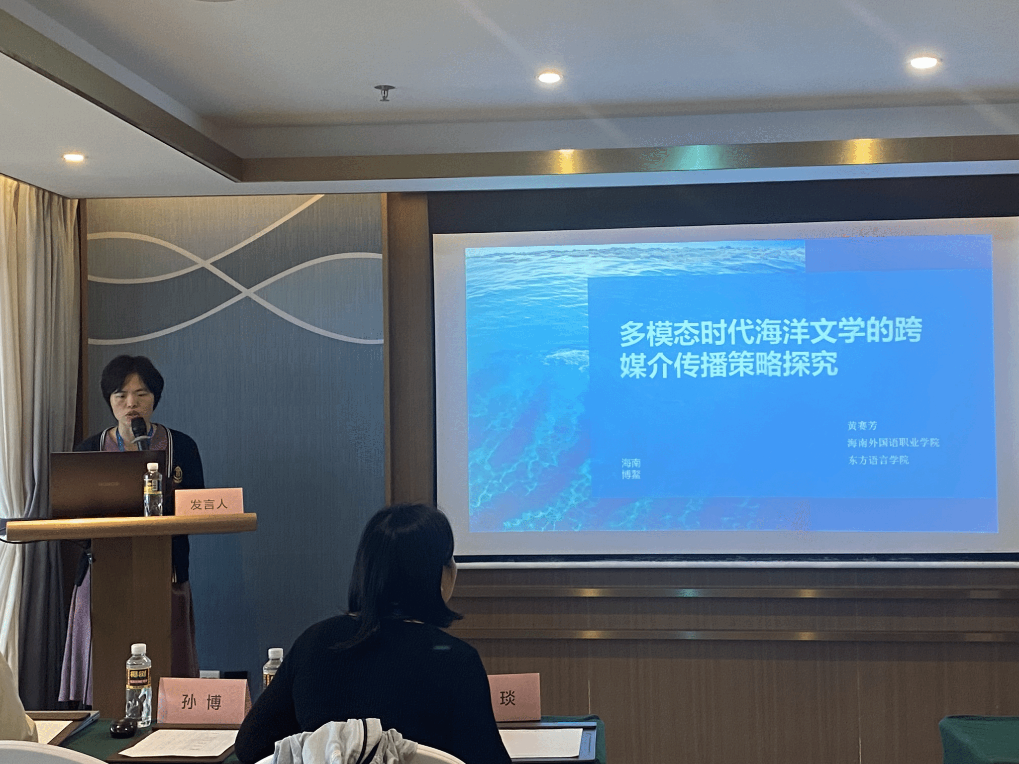 2024年11月23日下午,孙博副会长主持“中外文学(化)交流.跨文化.翻译与传播”分论坛。黄赛芳副教授作题为“多模态时代海洋文学的跨媒介传播策略探究”的主旨发言,主要从多模态时代海洋文学的跨媒介传播现象着手,分析了海洋文学作品在文字、影像、网络平台等多种媒介上的经典传播案例,探讨海洋文学的跨媒介传播策略,为多模态时代海洋文学的创新发展建言献策。
