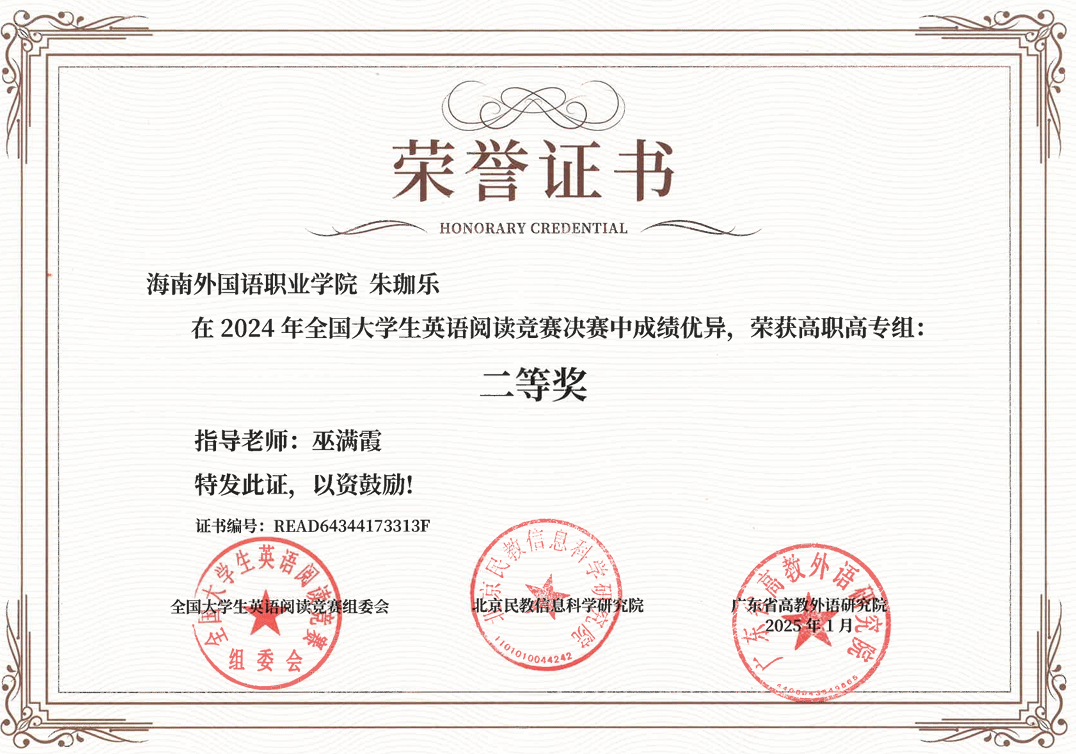 近日,由全国大学生英语阅读竞赛组委会、北京民教信息科学研究院和广东省高教外语研究院联合主办的2024年全国大学生英语阅读竞赛决赛顺利落下帷幕。经过激烈角逐,beat365国际商务学院和英语学院的8名学生表现突出,从全国众多高校的选手中脱颖而出,喜获佳绩。其中,朱珈乐荣获高职高专组二等奖,张桂麦、何佩涵、盛娟惠、吴佳瑶、刘思彤、陈春桃和羊诗意荣获高职高专组三等奖。