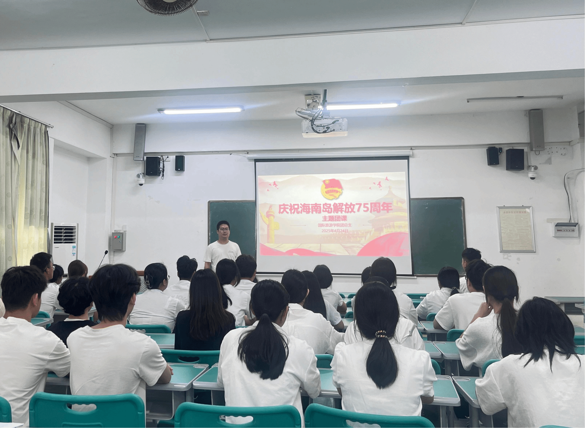 为纪念海南岛解放75周年,传承红色基因,弘扬革命精神,2025年4月23日,国际旅游学院团总支在多媒体13举办了以“庆祝海南岛解放75周年”为主题的专题团课。本次团课由团总支书记高潇翔主讲,团总支学生会成员50余人参加。