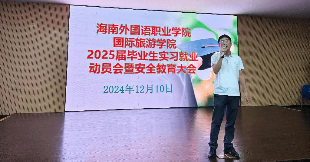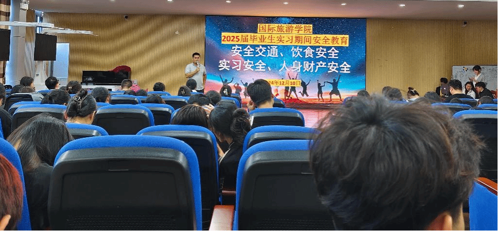 2024年12月10日,国际旅游学院2025届毕业生实习就业动员会暨实习安全教育大会在beat365图书馆VR导游实训室召开,国际旅游学院谢孟副院长、周群林副书记、教研室主任、实习就业指导老师和2025届12月参加岗位实习的毕业生参会。