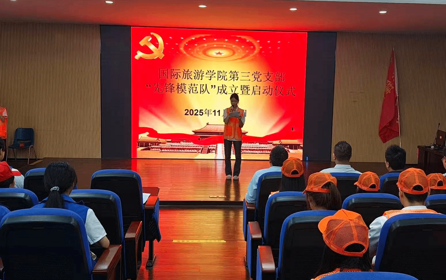 为进一步加强基层党组织建设,充分发挥学生党员的先锋模范作用,引领广大青年学子立志成才、服务社会,2025年11月14日下午,国际旅游学院于图书馆四楼VR实训室隆重举行了“先锋模范队”成立暨启动仪式。学院党总支副书记周群林、第三党支部全体党员及首期全体先锋模范队队员共同见证了这一重要时刻。