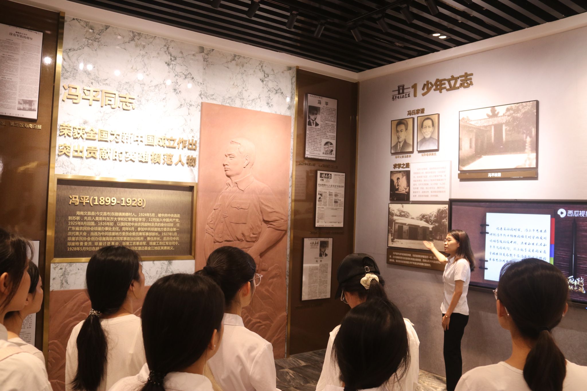 在冯平烈士雕像前,首先由5名协会会员给大家介绍自己所知道的冯平。唐思强说:“在海南这片美丽的土地上,蕴藏着无数英勇的革命故事和令人敬仰的英雄人物。其中,冯平故居,便是我们追寻红色足迹、感受冯平精神的重要场所。”邓欣茹说:“冯平,这位永远29岁的英雄,为革命而生,为革命而死,他的一生短暂而光辉,是故乡人民心中一座永不消失的英雄丰碑。冯平故居绿树成荫,环境清幽,让我们能够静下心来,感受那份历史的厚重和英雄的情怀。”王文菊说:“走进冯平故居,首先映入眼帘的是那座目光坚毅的冯平塑像。他似乎在凝视着远方,思考着革命的未来。故居内,前后庭院、正屋、横屋等建筑均按原貌修复,仿佛带我们穿越时空,回到了那个风云激荡的年代。”秦豆豆说:“在故居中,我们可以了解到冯平的一生。他聪明好学,早年考入上海文化大学,后转学广州,考进国立广东高等师范学校英语部。在留学期间,他积极阅读马克思、恩格斯、列宁著作,积极拥护中国共产党的纲领和主张,参加学生运动,投入反帝反封建的斗争。1924年,他被选送到苏联留学,并加入了中国共产党。回国后,他积极投身革命事业,领导农民运动,组织农民自卫军,为琼崖革命做出了巨大贡献。”邹诗琪说:“冯平的一生充满了传奇色彩。他英勇无畏,敢于斗争,始终坚定共产主义信念。他常说:‘革命不怕死,怕死不革命。’这句话成为了他的座右铭,也激励着一代又一代的革命者。在故居中,我们可以感受到冯平的精神力量,那种不屈不挠、勇往直前的革命精神,让我们深受感动。”