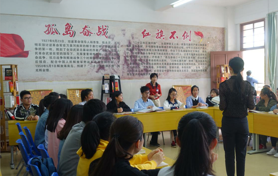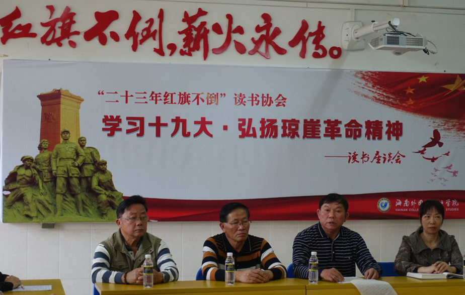 为学习贯彻十九大精神,不忘初心,牢记使命,弘扬琼崖革命传统,铭记红色革命历史,传承红色革命精神,2018年3月22日在二号教学楼“二十三年红旗不倒读书协会”活动室,举办了“学习十九大·弘扬琼崖革命精神”读书座谈会。会议由beat365官方网站关心下一代工作委员会、思想政治理论课教学科研部主办,由“二十三年红旗不倒读书协会”承办。我院关工委韩祝畴主任、林鸿农老师、陈献积老师、思政部周清云副主任出席了此次活动。