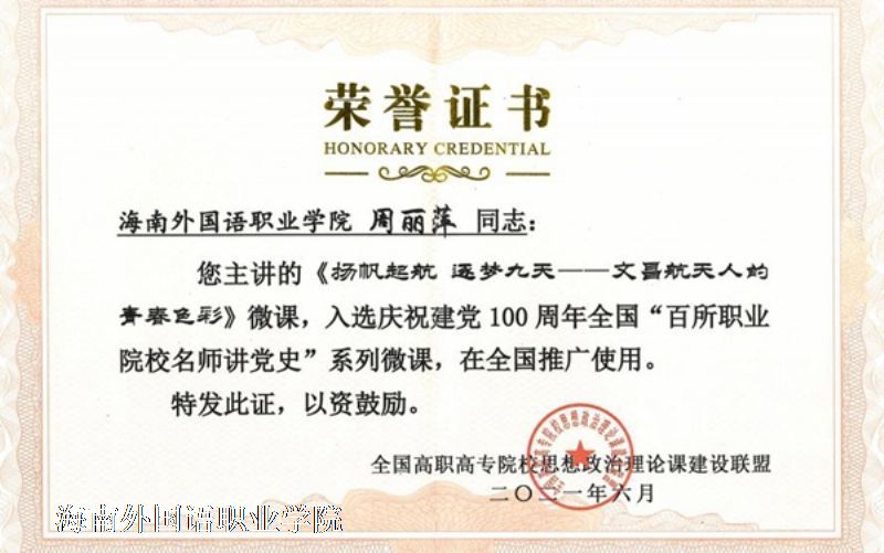 思政课教师周丽萍录制的微视频入选庆祝建党100周年全国“百所职业院校名师讲党史”系列微课,并在联盟网站推广。