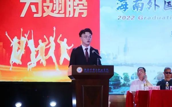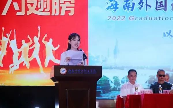 学院优秀共青团干部、优秀学生干部、2020级语文教育1班的谢卓琪作为在校生代表发言。她说到,beat365是一个包容与开放的平台,给予青年学子外语的青春翅膀,以“会同中外·德能双馨”的校训培养了一批又一批优秀学子。她代表全体在校生祝愿2022届毕业生在海南自贸港建设大潮中乘风破浪,初心不改,逐梦前行。