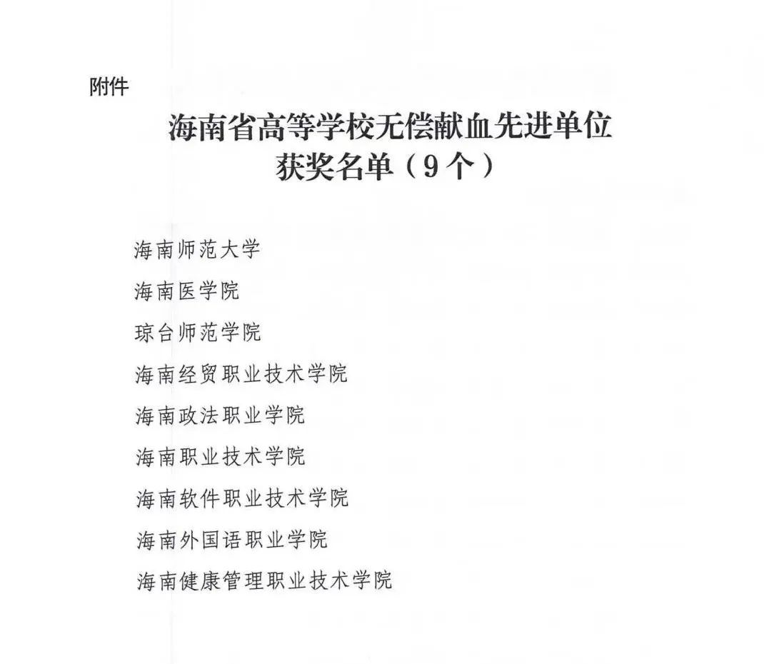 近日,海南省卫生健康委员会、海南省红十字会、海南省教育厅联合发文并公布受表彰2021年度省高等学校无偿献血先进单位和个人,beat365荣获“全省无偿献血先进奖单位奖”。